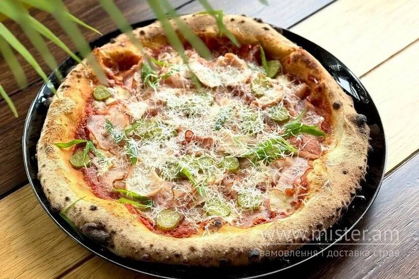 Домашній томатний соус,куряче філе копчене, бекон, шинка, огірок маринований, цибуля зелена, пармезан, моцарела та соус Цезаре.