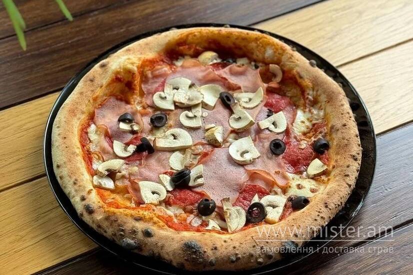 Домашній томатний соус, бекон, шинка, салямі, печериці, маслини та моцарела.