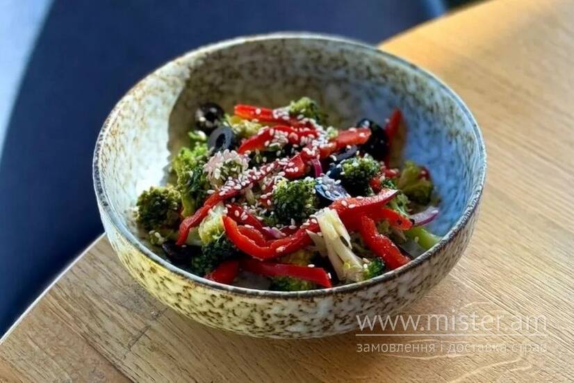 Овочевий салат з броколі, солодким перцем та стиглими маслинами. Готується з маринованою цибулею та кунжутом, з заправкою духм'яною олією.