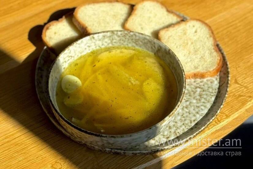 По-домашньому смачний курячий бульон з свіжою зеленню і перепелиним яйцем. За Вашим бажанням, додаємо фетучіні.