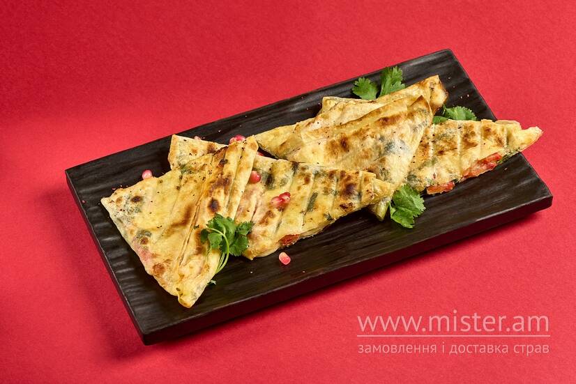 Тонкий грузинський лаваш, запечений на мангалі з томатами, базиліком та сиром.