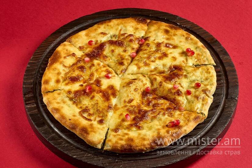 Традиційний грузинський пиріг із зернистим сиром, бринзою та кропом, запечений під шаром сулугуні.