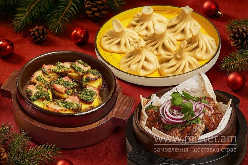 2 шт. хінкалі свино-яловичі, 2 шт. хінкалі з сиром сулугуні, мцваді зі свинини, картопля з підчеревиною. *Фото є прикладом подачі та може відрізнятись.