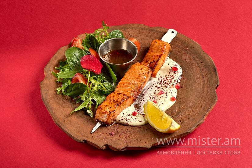 Обпалена форель на вугіллі, подана на мусі з сиру дорблю зі шпинатом та імбирно-устричним соусом.