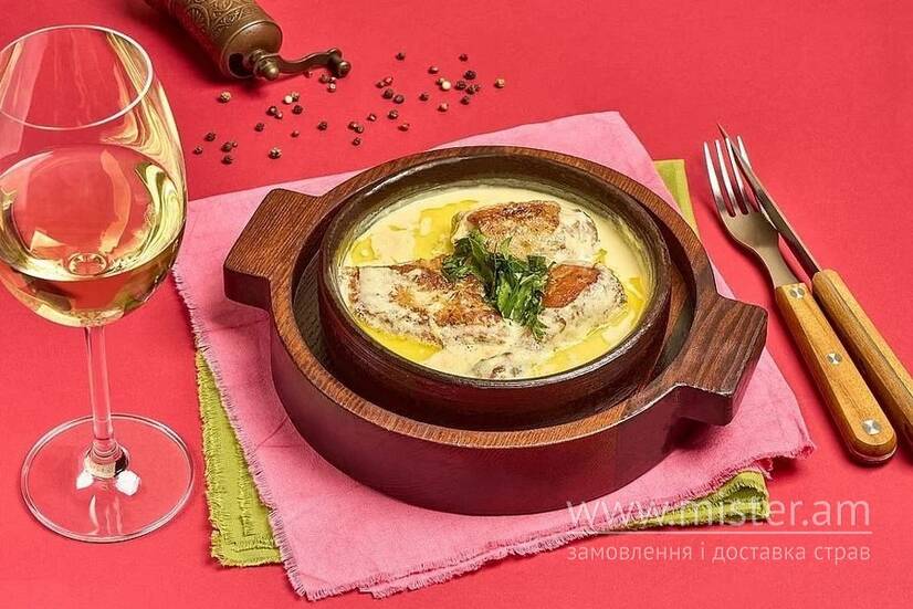 Фермерське курча, обсмажене до золотистої скоринки у густому вершково-часниковому соусі з ароматом грузинських спецій/