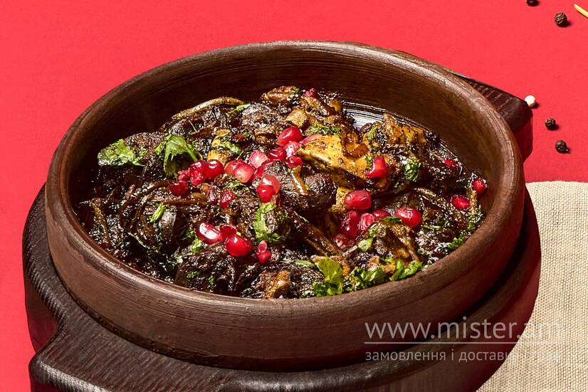 Курячі печінка, серце та шлуночки, обсмажені у власному соку з тархуном і грузинськими спеціями.