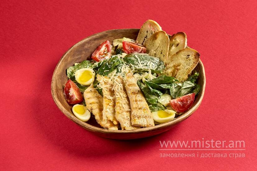 Соковита курка на грилі в поєднанні з хрустким айсбергом та роменом у класичному соусі з томатами чері, перепелиним яйцем, чіпсами з чіабати та пармезаном.