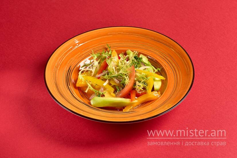 Мікс салатів із томатами, огірками, солодким перцем та червоною цибулею, заправлені духмяною олією та винним оцтом.