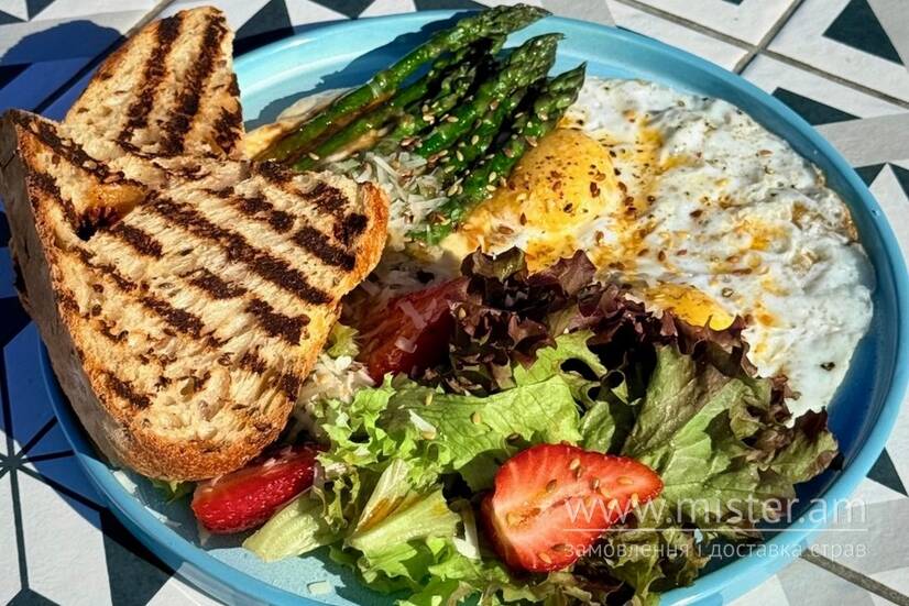 Яйця, спаржа, сирний соус з цибулею, пшенично-житній хліб, полуниця, мікс салат, олія соняшникова, вершкове масло, соус соєвий, часник конфі, мікрогрін, перець чілі пластівці, сіль.