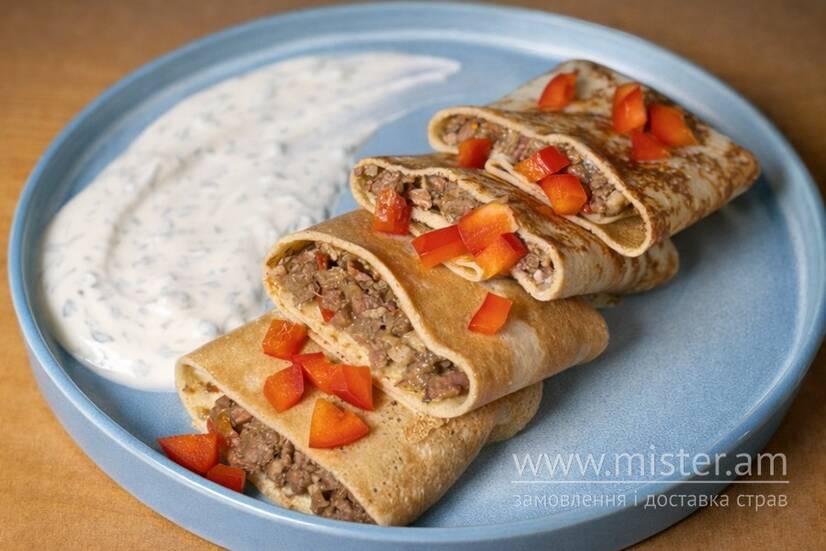 Млинці з телятиною і йогуртовим соусом