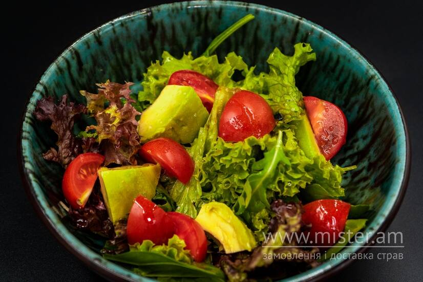 Мікс салату, томати чері, авокадо, оливкова олія, перець чорний