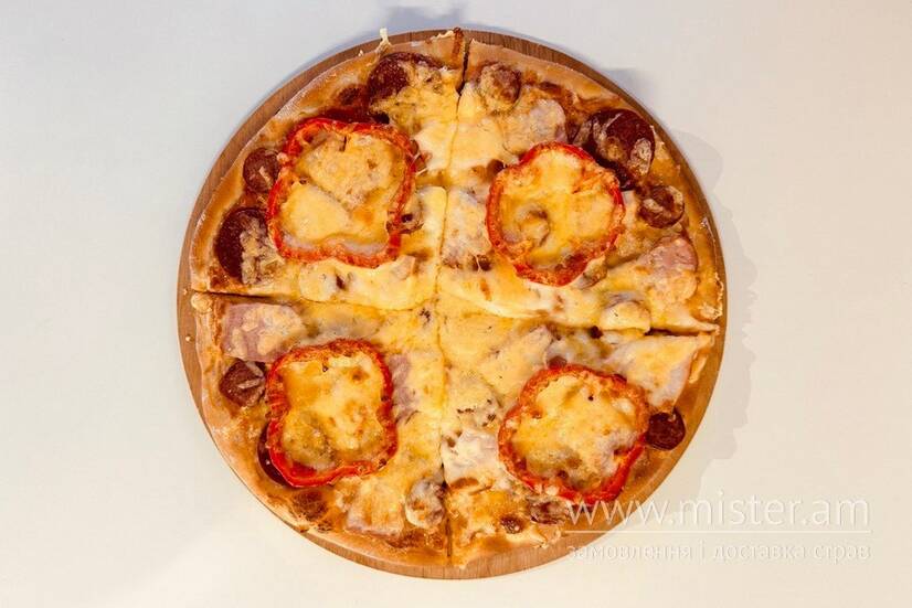 Копчене куряче філе, баличок, мисливська сосиска, салямі, болгарський перець, моцарела та твердий сир. Заправлено фірмовим білим та томатним соусом.