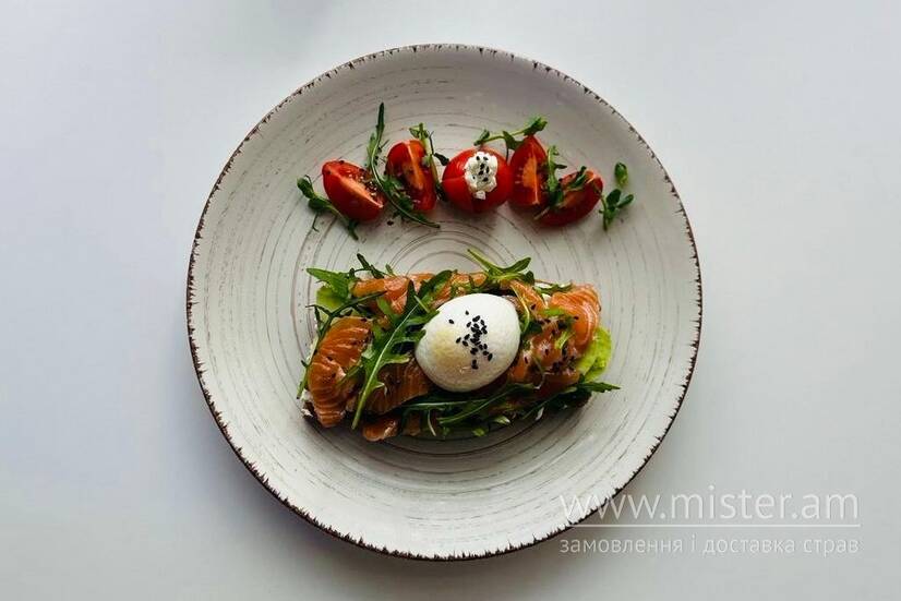 Хліб гречаний, лосось с/с, авокадо, томат чері, рукола, крем-сир, яйце пашот, сирний соус.
