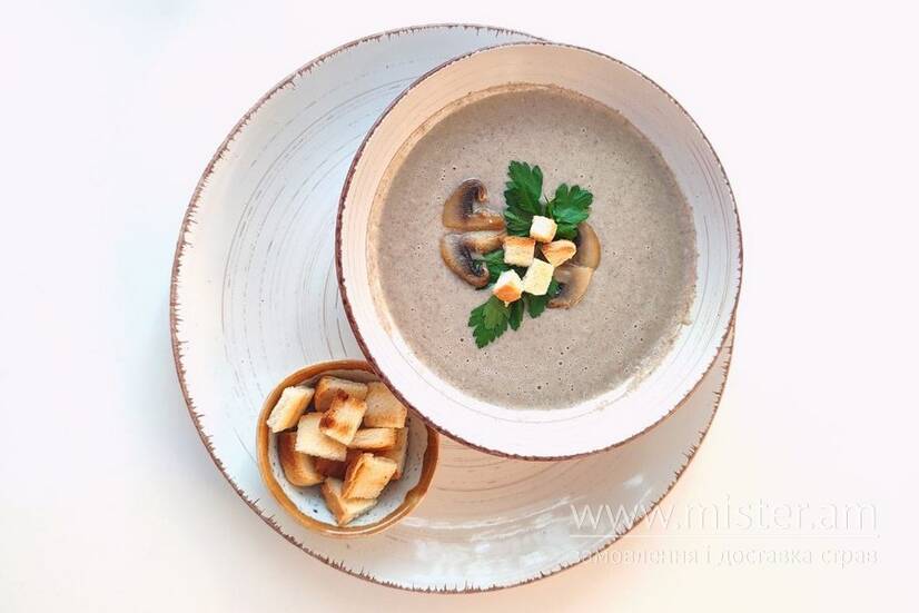 Печериці, плавлений сир, вершки, цибуля, мікрогрін, сухарики.