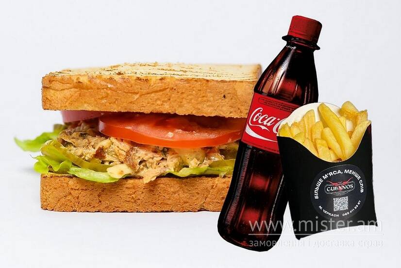 Cubanos в тостовому хлібі з курки + картопля фрі + напій 0,5 л.