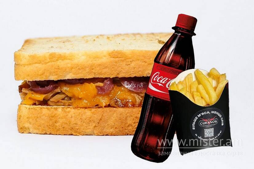 Cubanos в тостовому хлібі зі свинини + картопля фрі + напій 0,5 л.