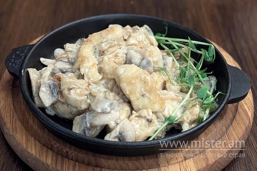 Судак, гриби, вершки, цибуля.