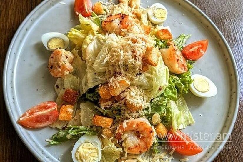 Мікс салату, айсберг, яйце, томати, креветки, часник, сир Пармезан, сухарі.