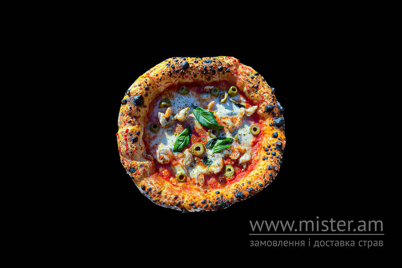 Томати пелаті, моцарелла, тигрові креветки, пармезан, зелені оливки, часник, чорний перець, зелений базилік, орегано, трюфельна олія.