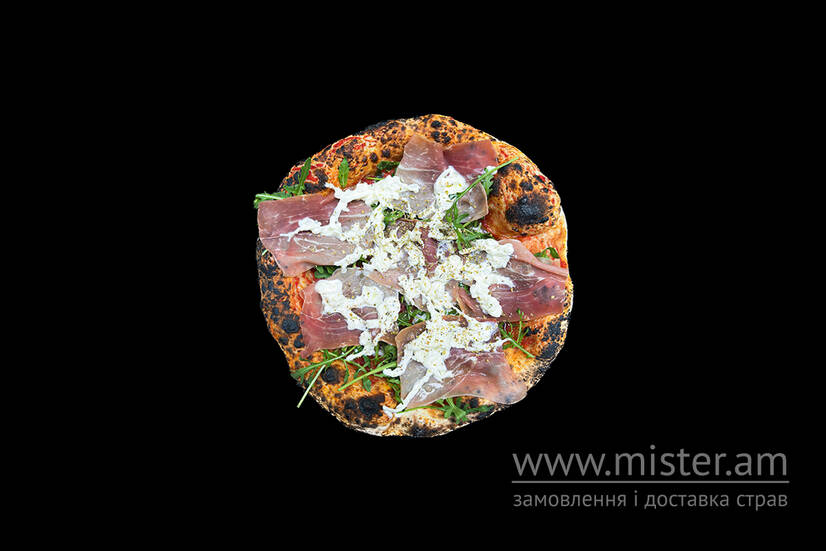 Томати пелаті, сир страчателла, прошутто крудо, рукола, орегано, оливкова олія.