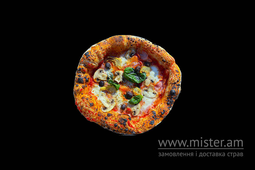 Томати пелаті, моцарелла, прошутто котто, гриби, артишок, темні оливки, зелений базилік, орегано.
