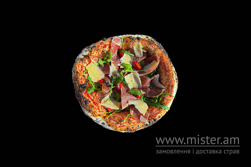 Томати пелаті, моцарелла, прошутто крудо, пармезан, чері, рукола, орегано, трюфельна олія.