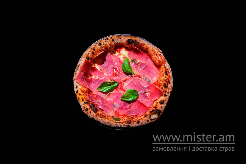 Томати пелаті, моцарелла, прошутто крудо, орегано, зелений базилік, трюфельна олія.