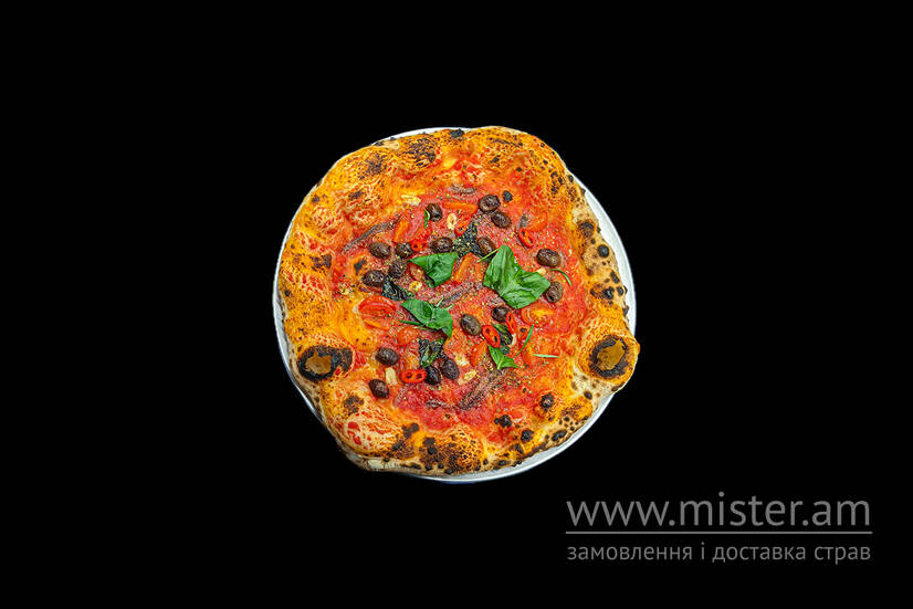 Томати пелаті, анчоуси, темні оливки, чері, часник, перчик чилі, розмарин, зелений базилік, оливкова олія, орегано.