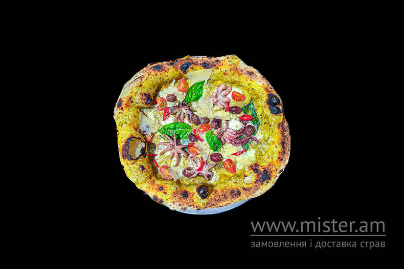 Cоус песто, моцарелла, бебі восьминіг, темні оливки, чері, пармезан, перець чілі, зелений базилік, орегано, трюфельна олія.