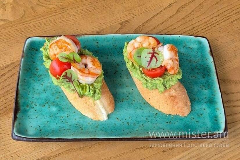 Багет, креветки, авокадо, помідори свіжі, крем-сир.