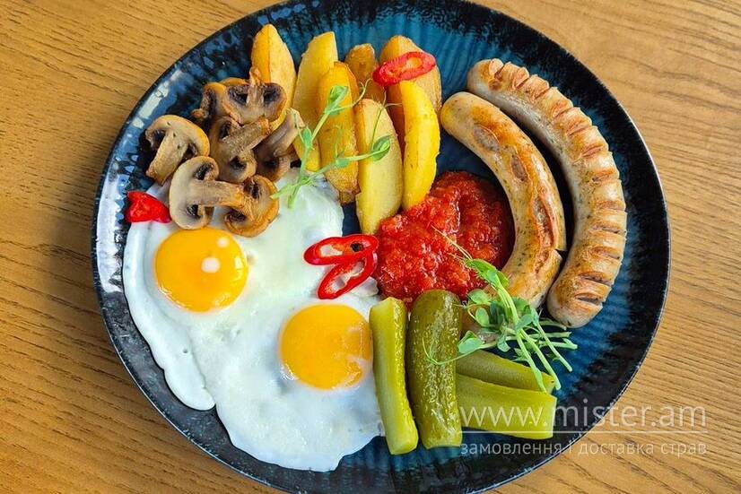 Яєчня з 2-х яєць, мюнхенські ковбаски, картопля по-селянськи, печериці, солоний огірок, аджика.