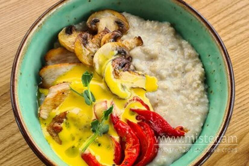 Вівсянка, приготована на молоці, з додаванням підсмажених овочів, курочки та сирного соусу Бешамель.