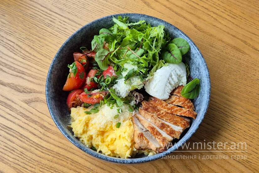 Скрембл з 3-х яєць, смажена індичка, сир фета, мариновані помідори, овочевий салат.