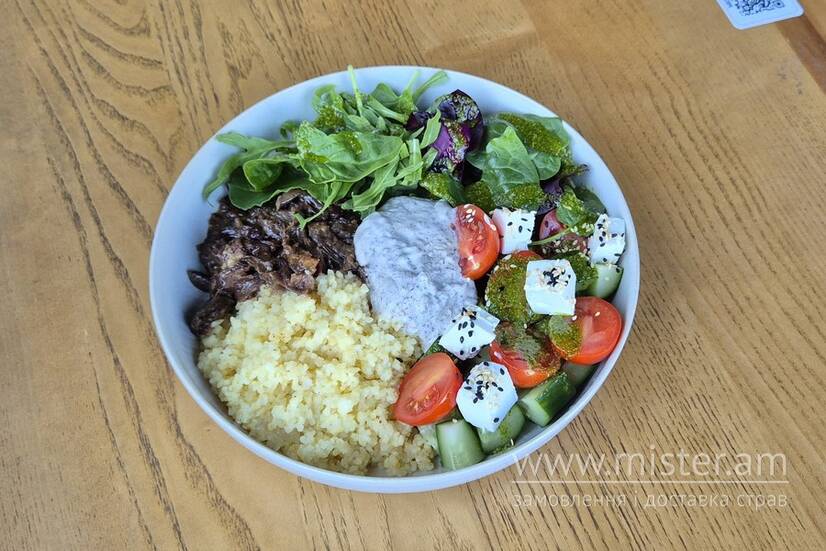 Булгур, запечена телятина, овочевий салат з фетою, грибний соус, кунжут.