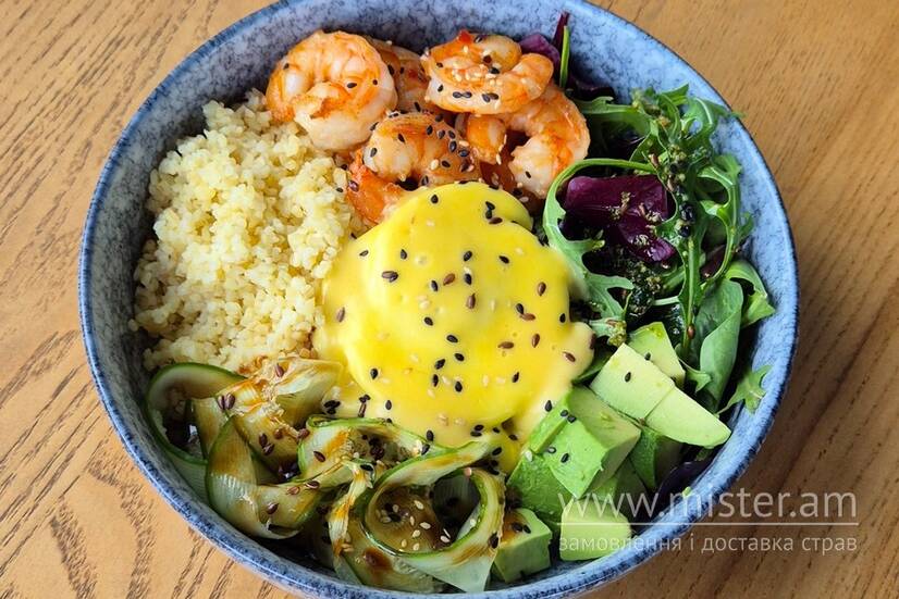 Булгур, креветки в соусі Чилі, кунжут, яйце-пашот, авокадо, огірки, зелений салат,соус Бешамель, пряне зелене масло.