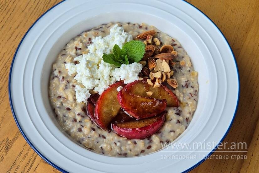 Вівсяна каша приготована на кокосовому молоці, насіння льону, сир кисломочний, мигдаль, фундук, карамелізовані яблука, свіжа м`ята.