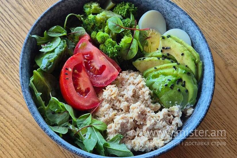 Ніжна вівсянка, подається з авокадо, мікс салату, брокколі, помідорами та яйцем.