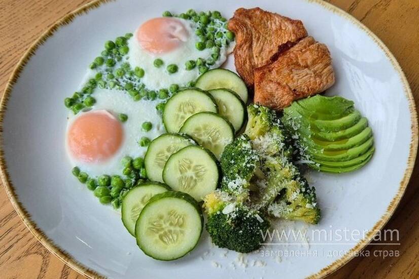 Яєчня з 2-х яєць, смажена індичка, броколі, авокадо, свіжий огірок, зелений горошок.