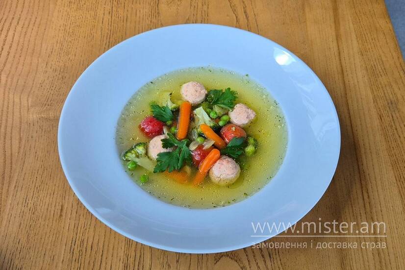 Бульйон на основі лососевих мітболів, горошок зелений, капуста брокколі, морква бейбі, помідори чері, стебло селери, спеції.