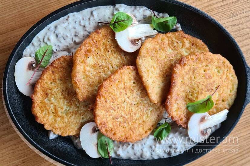 Хрусткі деруни, соус вершково-грибний, слайси з печериць.