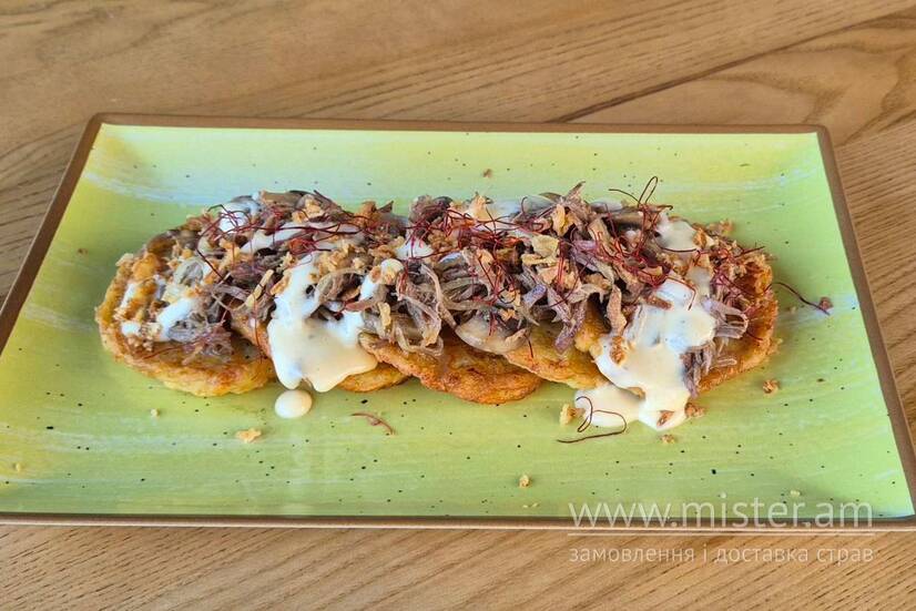 Хрусткі деруни, поєднані з ніжною рваною телятиною, печерицями і сирним соусом Бешамель.