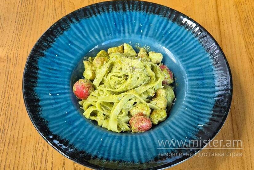 Макарони твердих сортів, пармезан, помідори чері, філе куряче підсмажене, соус Базиліковий.