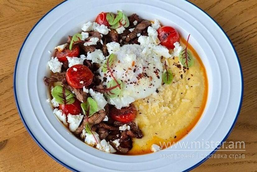 Кукурудзяна каша, приготована на молочних вершках, зі смаженою телятиною, беконом, печеними томатами, яйцем-пашот та бринзою.