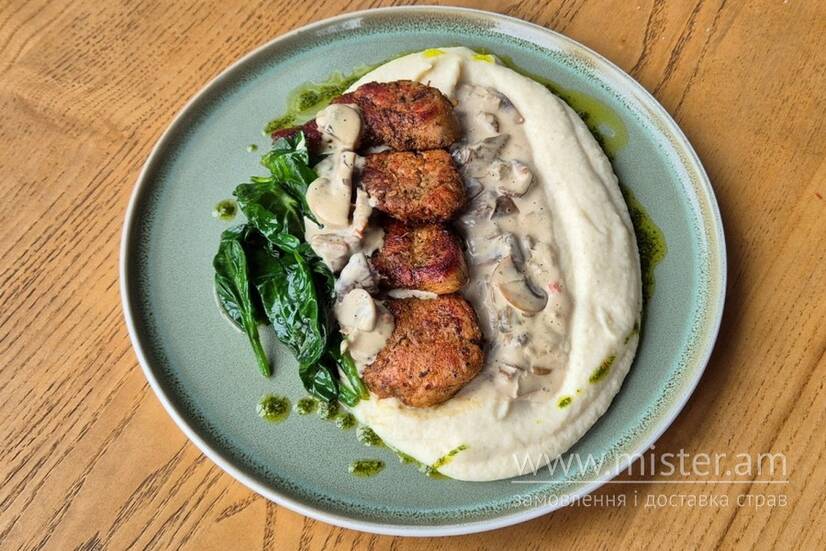 Вирізка зі свинини, картопляне пюре із селерою, салатний лист, шпинат, пряне зелене масло, соус з білих грибів, соус соєвий, часник.