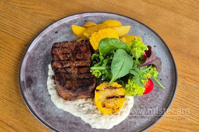 Стейк з телятини, картопля, кукурудза гриль, зелень мікс салату, помідори чері, спеції, соус грибний, медовий з базиліком.