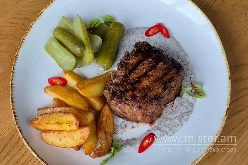 Стейк з телятини, картопля по-селянськи, солоні огірки, грибний соус.
