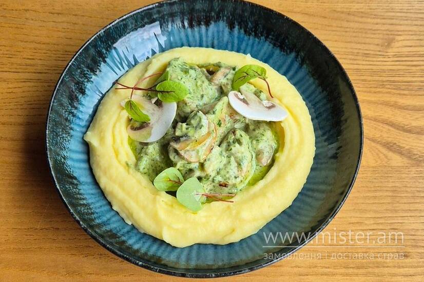 Запечений судак, гриби шампіньйони, картопляне пюре, зелена цибулька.