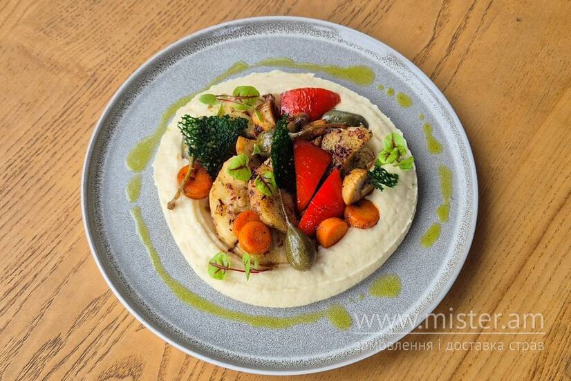 Смажене філе судака, картопляне пюре із селерою, печериці, каперси, морква Бейбі, перець болгарський, цибуля синя, пряне зелене масло.