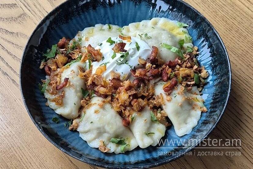 Вареники з ніжною начинкою з картоплі та печінки, заправлена підсмаженим беконом і з цибулею.