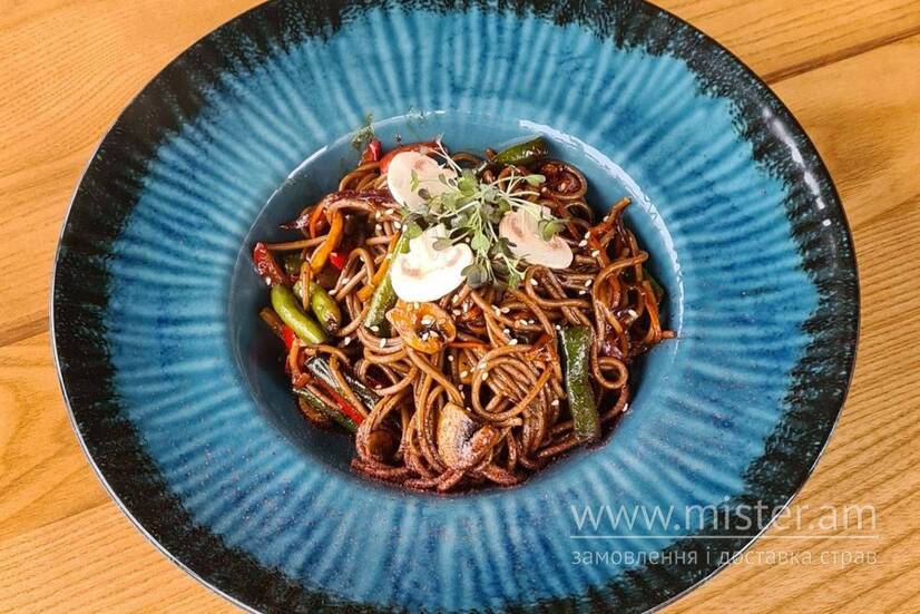 Печериці, морква, перець болгарський, локшина соба, цибуля, часник, кунжут, соус соєвий, соус унагі та соус чилі.